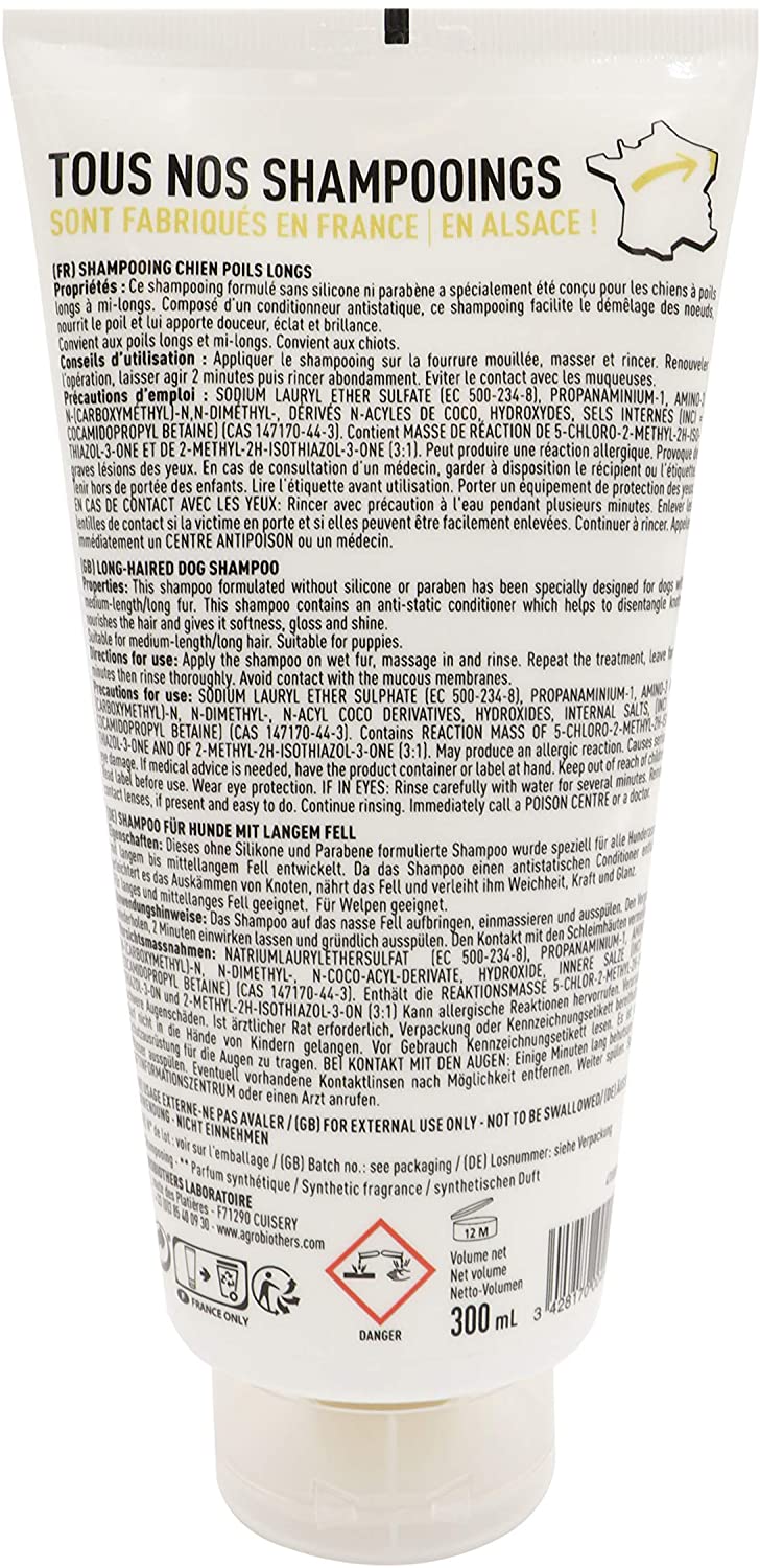- Shampoing pour chien à poils longs : composé d'un conditionneur antistatique, facilite le démêlage des nœuds et fait briller le pelage de votre chien