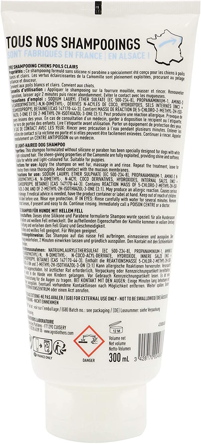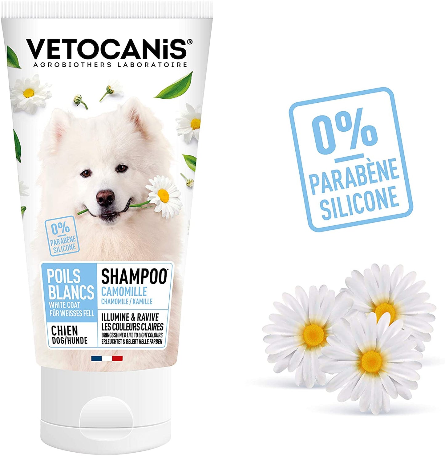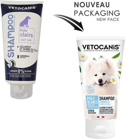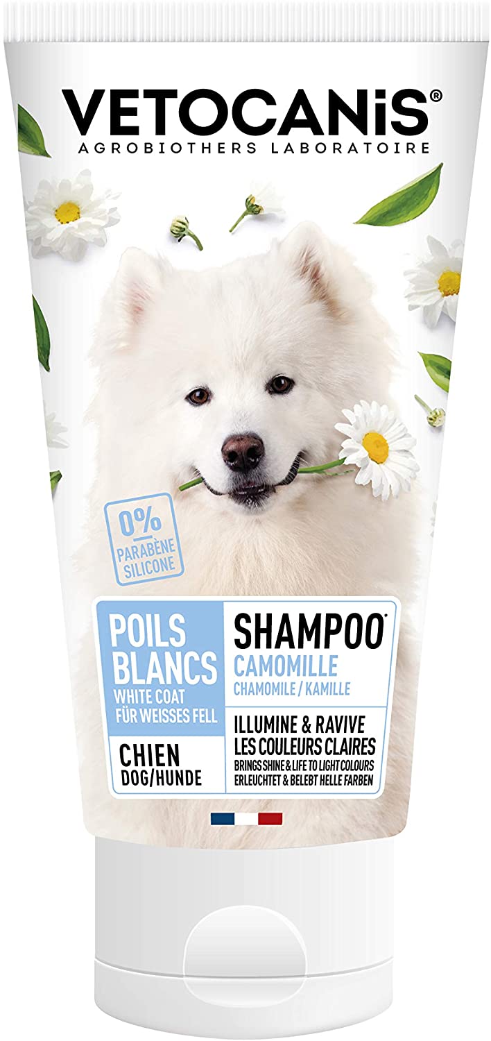 Vetocanis White Hair Shampoo is specially designed for dogs with light or white hair. Chamomile extracts, a plant known for its lightening properties, are fully exploited in this shampoo that gives your pet's coat a shiny and silky appearance. Your dog will regain all the radiance and beauty of his beautiful white coat after each shampoo. Suitable for white and light hairs. Suitable for puppies. Format 300 ml All our Shampoos are made in France, in Alsace, and under Veterinary Control.