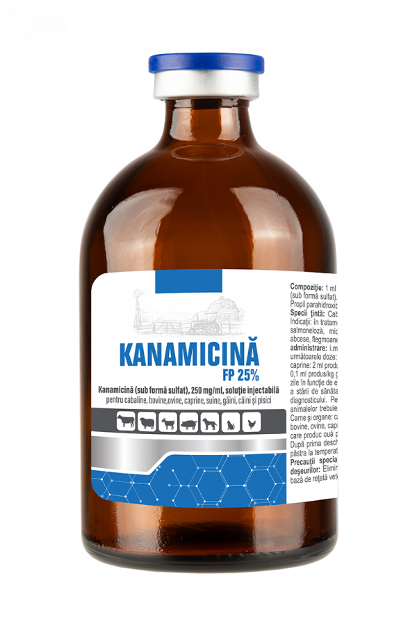 Kanamicina FP 25% 100 ml// Cavalli, bovini, pecore, capre, suini, uccelli (polli), cani e gatti // Chevaux, bovins, ovins, caprins, porcs, oiseaux (poulets), chiens et chats